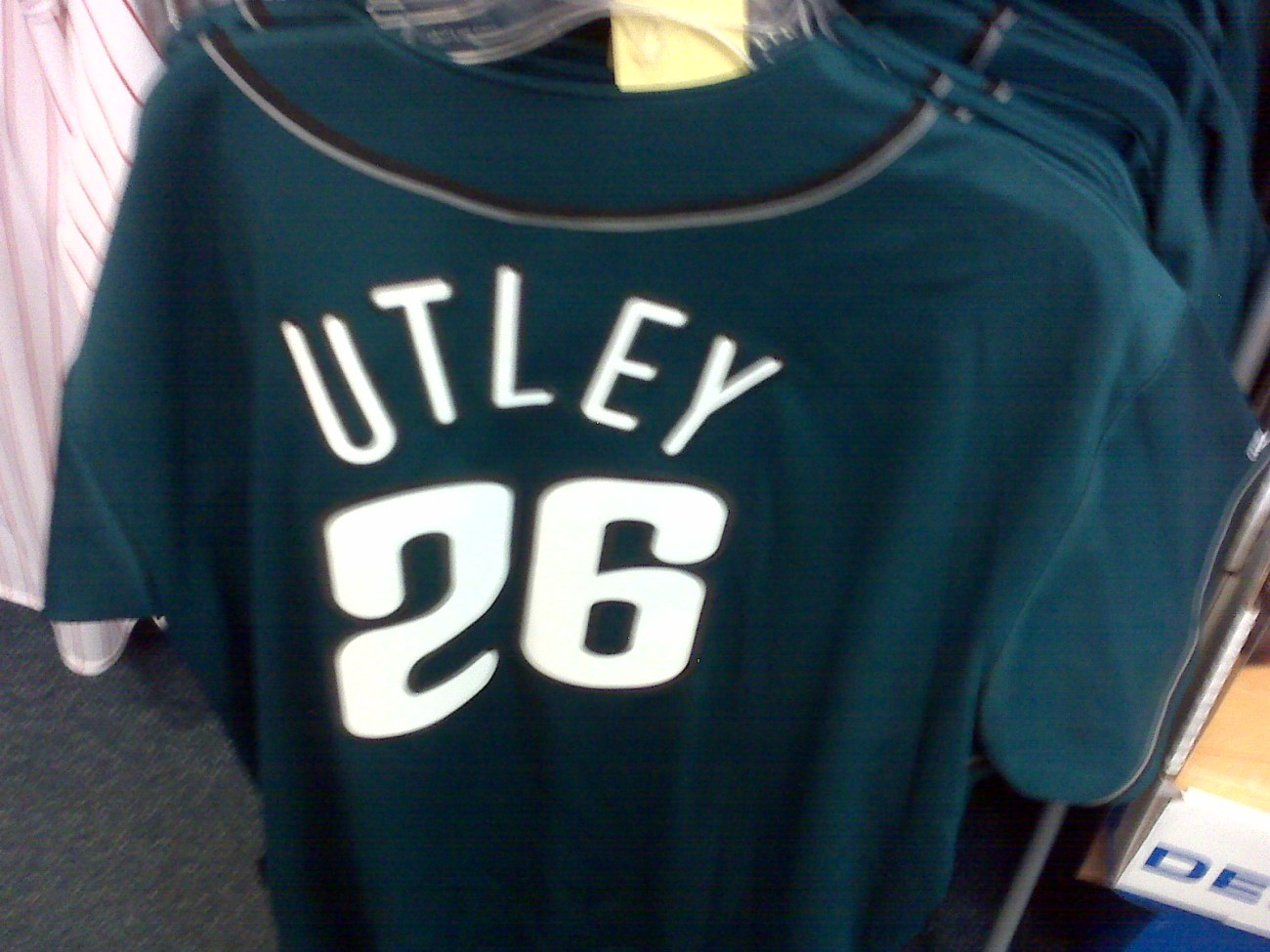 The store, to no fault of its own, was selling a Chase Utley Phillies jersey…in the midnight green colors of the Philadelphia Eagles.