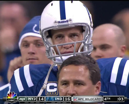 After bailing out Taj Smith following an egregious running into the kicker penalty, Peyton Manning watched from the sideline as Nick Folk and the New York Jets knocked off the Colts in the AFC Wild Card round, 17-16 on Saturday night.