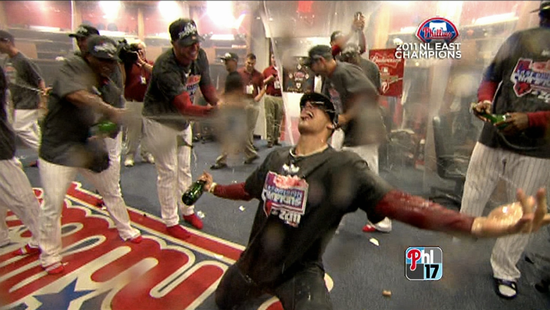 This pic is from last night’s NL East clincher versus the St. Louis Cardinals. It shows what happens when you leave baseball purgatory (Houston) and arrive on a contending team.