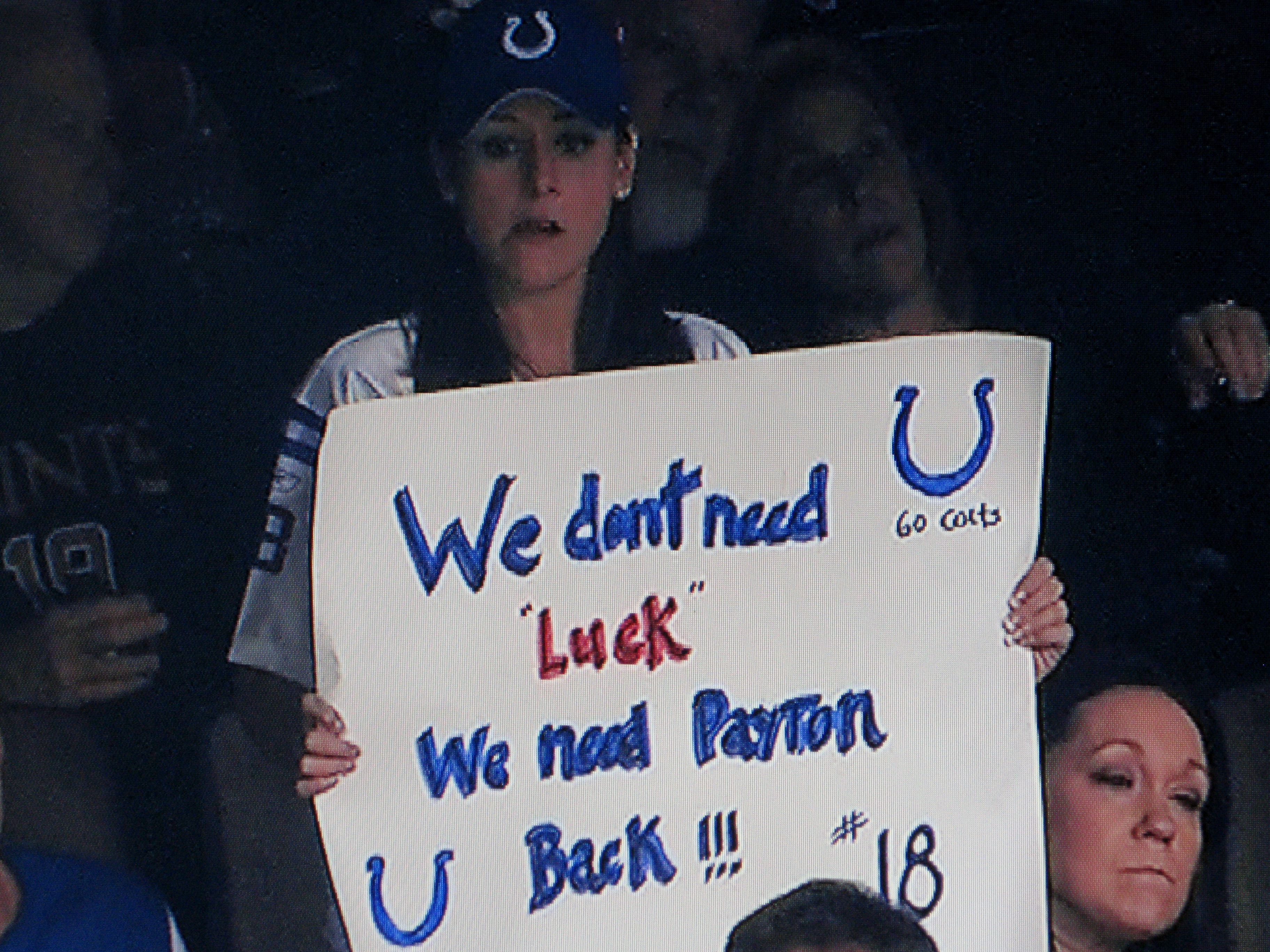 Apparently, the spell check mechanism with this young lady wasn’t working on Sunday night when she stated in a sign that Indy didn’t need “Luck” (see, Andrew) but instead longed for Payton Manning back in the fold.
