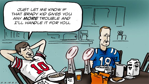 ESPN NFL insider Adam Schefter posted this comical cartoon on his Facebook page about Peyton and Eli Manning’s relationship when it comes to facing Tom Brady.