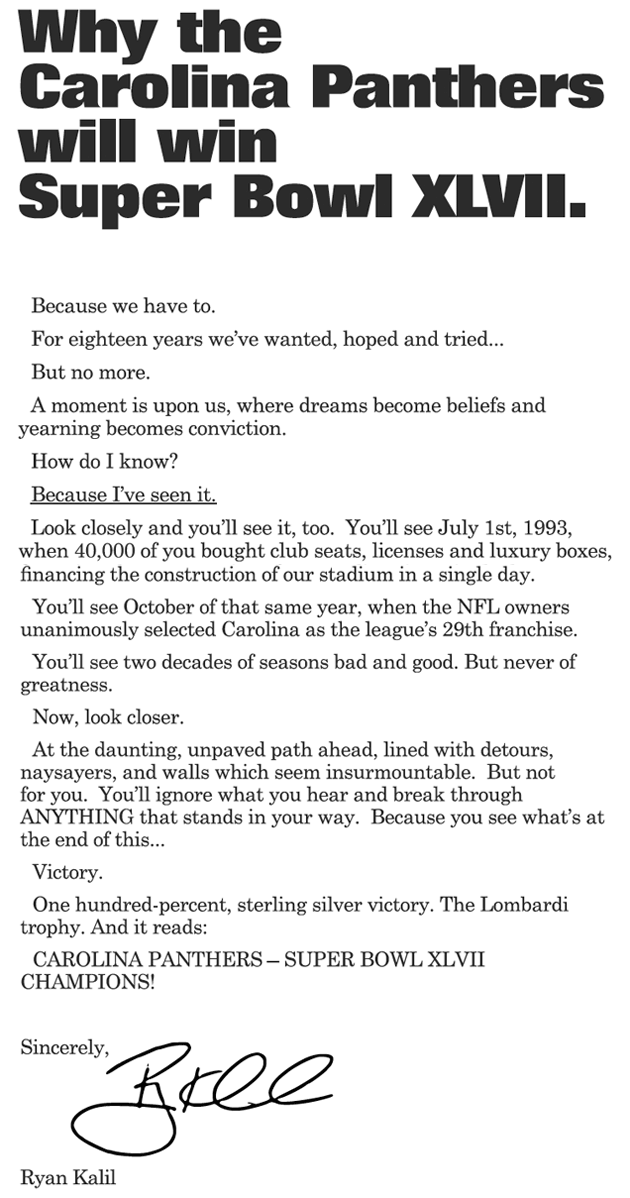 Instead, Carolina Panthers center Ryan Kalil released this letter to the Charlotte Observer, which means you’ll forget he ever did this by next spring…unless the Panthers actually win the Super Bowl.