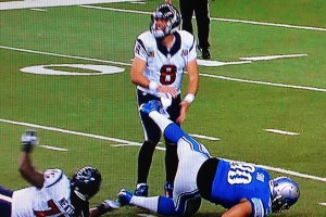 One part of Matt Schaub’s lower body will struggle to celebrate on Thanksgiving. Detroit’s Ndamukong Suh was back to his old, questionable tricks when his foot ended up kicking Houston’s Matt Schaub below the belt during the first half of the Texans/Lions Thanksgiving battle.