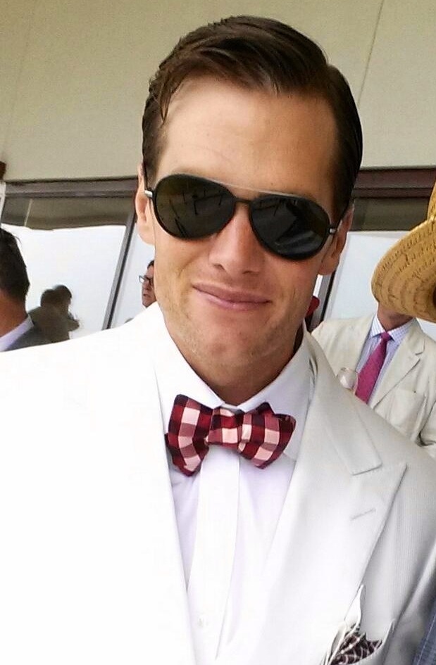 Here is your football lord and savior looking resplendent in a white suit with red and white bow-tie.