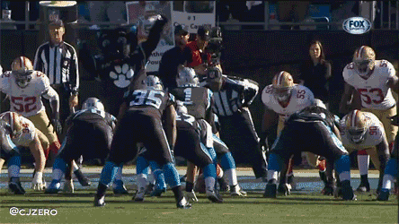 San Francisco’s Ahmad Brooks hopped over the line in anticipation of Carolina’s next play. As he flew past the line, Brooks lightly contacted Newton, which promptly led to the Auburn product acting like an anvil fell out of the sky on him.
