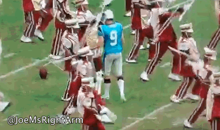 Gano practiced field goals during a halftime performance. The only problem turned out to be that he was literally in the middle of the proceedings.