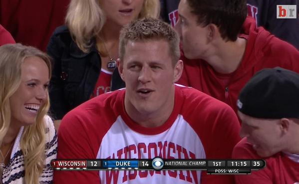 Wisconsin alum J.J. Watt is in Indianapolis for Monday’s national title battle between the Badgers and Duke Blue Devils to cap the 2015 college basketball season.