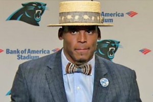 Once Cam Newton finished torching the San Francisco 49ers on Sunday, he took the podium to display his latest fashion choice.